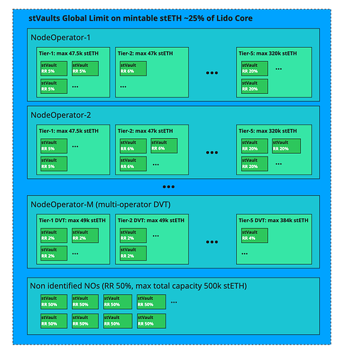 Each Node Operator is assigned a set of Vault Tiers (an example of a vault group). A Tier defines two things: the Reserve Ratio (RR) and the total stETH minting cap.