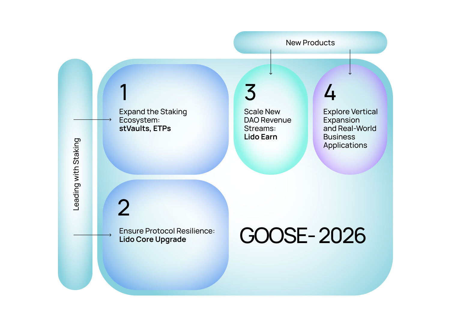 This section sets out a proposed set of strategic goals for Lido DAO for the 2026 cycle, together with a three-year vision. If the proposal is accepted, Lido DAO will adopt the following goals as its own strategic direction and enter its next growth chapter by expanding its staking product line and developing end-user products that capture higher value and strengthen its strategic position, broadening the offering, attracting new demand, and diversifying revenue.